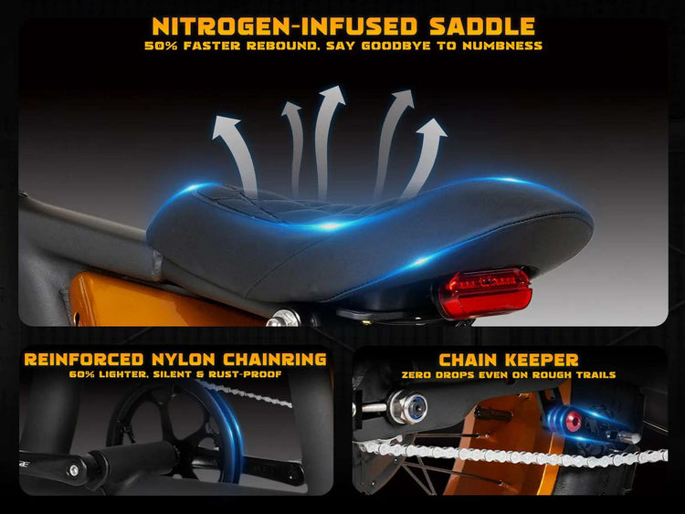 • Uncomfortable saddles and rough rides – Nitrogen-infused saddle and dual suspension absorb shocks