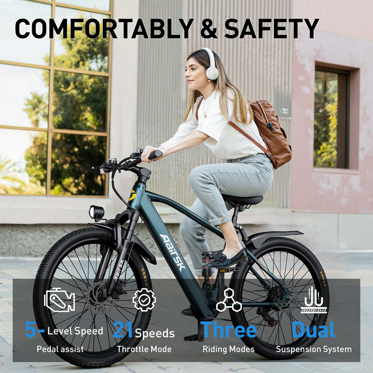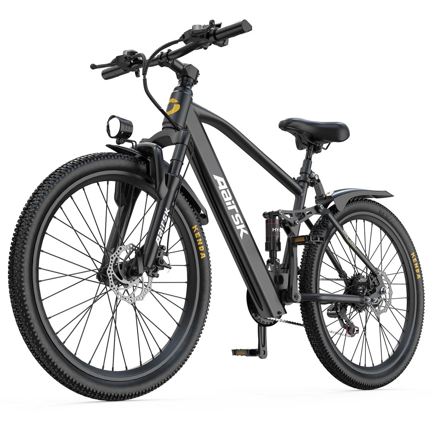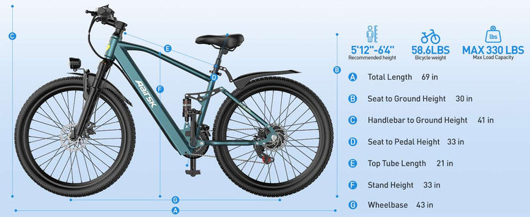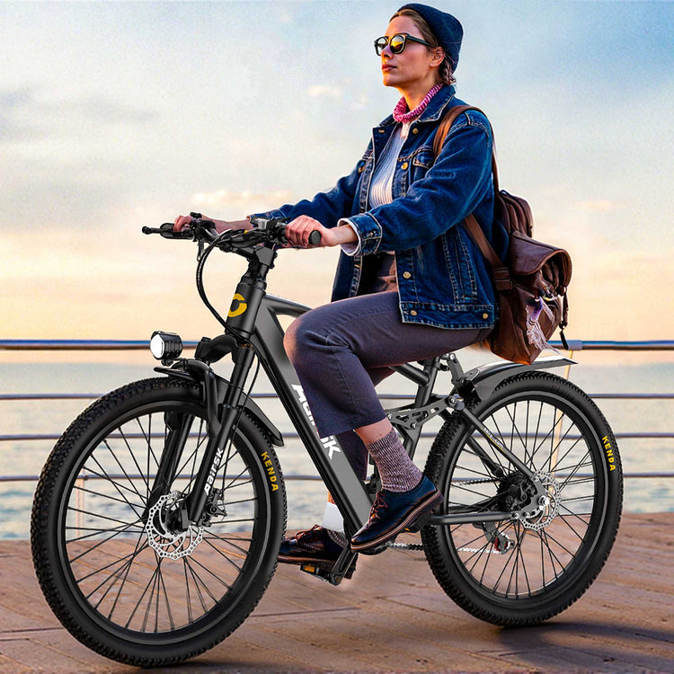 • Front & Rear Suspension: A full suspension system absorbs shocks and vibrations from both wheels. Rough trails, cobblestone streets, and hidden potholes disappear beneath you.