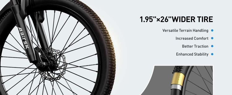• 26" All-Terrain Tires: Paired with the suspension, these wide tires provide excellent grip and stability on loose gravel, hard-packed dirt, wet pavement, and everything in between.